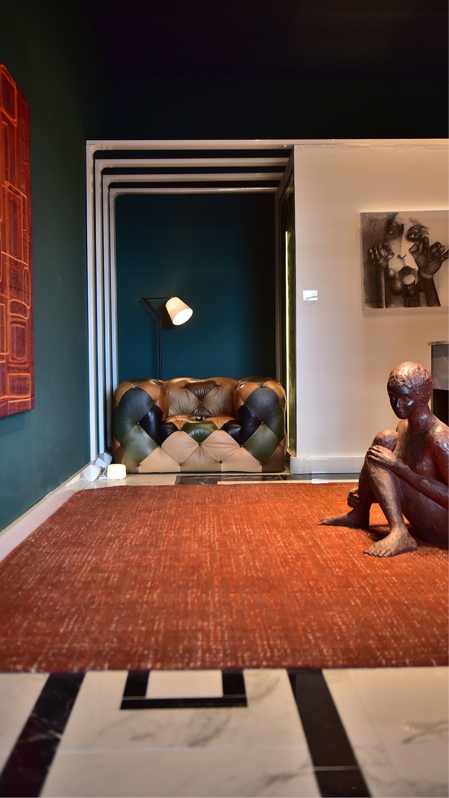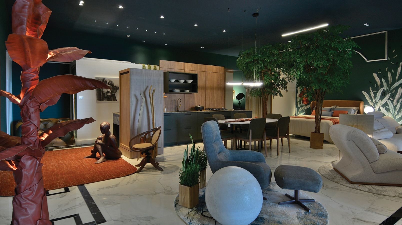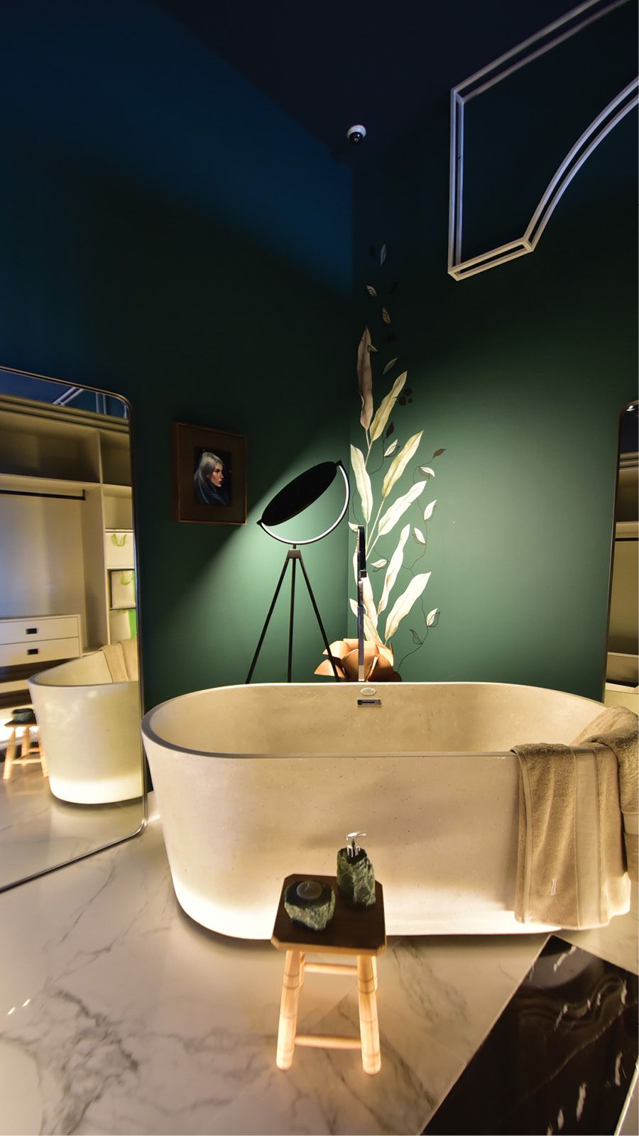 O estudo de feng shui, Escola da Bússola, grande afinidade com a Biofilia, proporciona harmonia, trazendo pelo caminho, natureza, equilíbrio, mistério e elegância. O verde das florestas, o azul do céu, circundam ambientes setorizados e integrados. A iluminação é pontual, aquecida, traz conforto. Embutidos, fitas de LED, lustre e abajures do Laboratório da Luz . No hall, obras de arte e a cadeira Gerdau beirando 100 anos. Memória afetiva do arquiteto, de sua bisa. Em seguida, para meditação, poltrona em retalhos de couro visam sustentabilidade, assim como a banheira de imersão Mykonos Grani Ecostone, da Acquamondo, reintegra resíduos das demais banheiras.