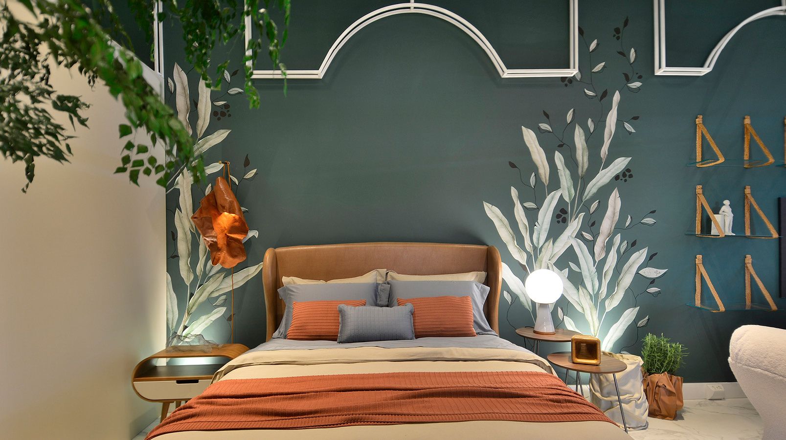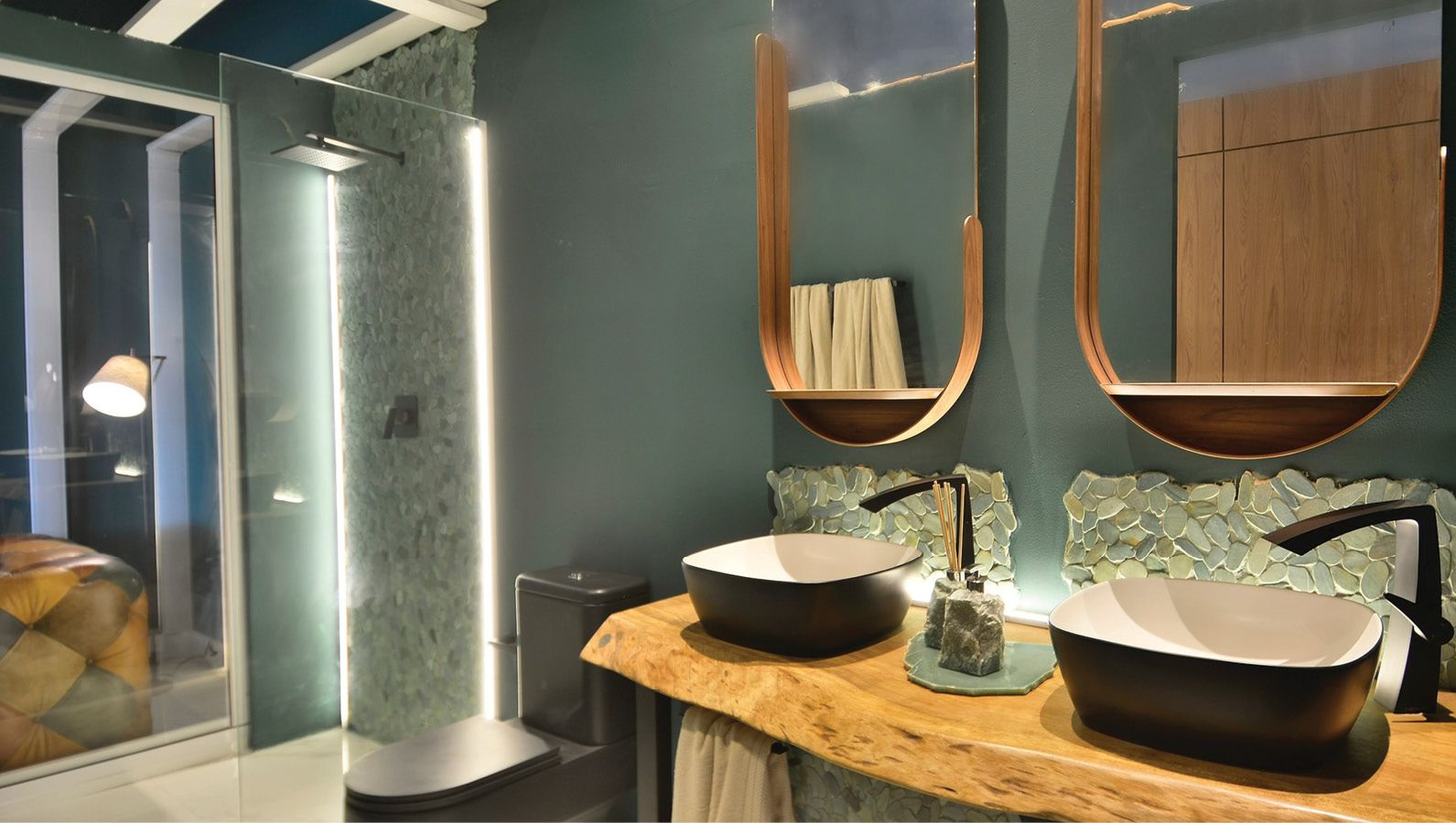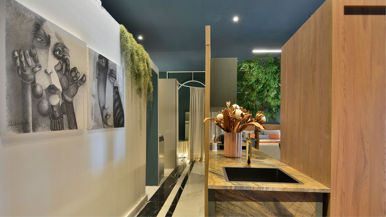 No banheiro casal, cubas e torneiras com design moderno, acabamento black, assim como chuveiro, acessórios e metais dourados pelo loft, Lexxa Bagno. Também em preto, vaso sanitário da Stylo Elevato. Destaque ao revestimento em rocha natural Green Bali Seixo Telado, lembrando seixos dos rios, encantam! Além dos produtos banho, a cama do casal é puro aconchego. Sofisticação da Casa Lloma. Maciez ao toque e paleta de cores indo do cinza azulado ao terroso. Ao lado da cama, o pendente “Casulo”, nomeado pela arquiteta, vira ícone. Em couro, o designer C. Confortin, abriga arte e luz, idem a bananeira iluminada, revelam dramaturgia! E surpreende ... outra com hastes móveis: tacos, cordas e telinhas. Árvores preservadas e gradis buscam caráter urbano, alternando vegetações adesivadas. Jéssica, Je. Gaia, revela sua arte. Com a caneta Polska, delineou sensibilidade! A lareira Piccolo Firenze é da Quatrum Lareira. Alto desempenho.