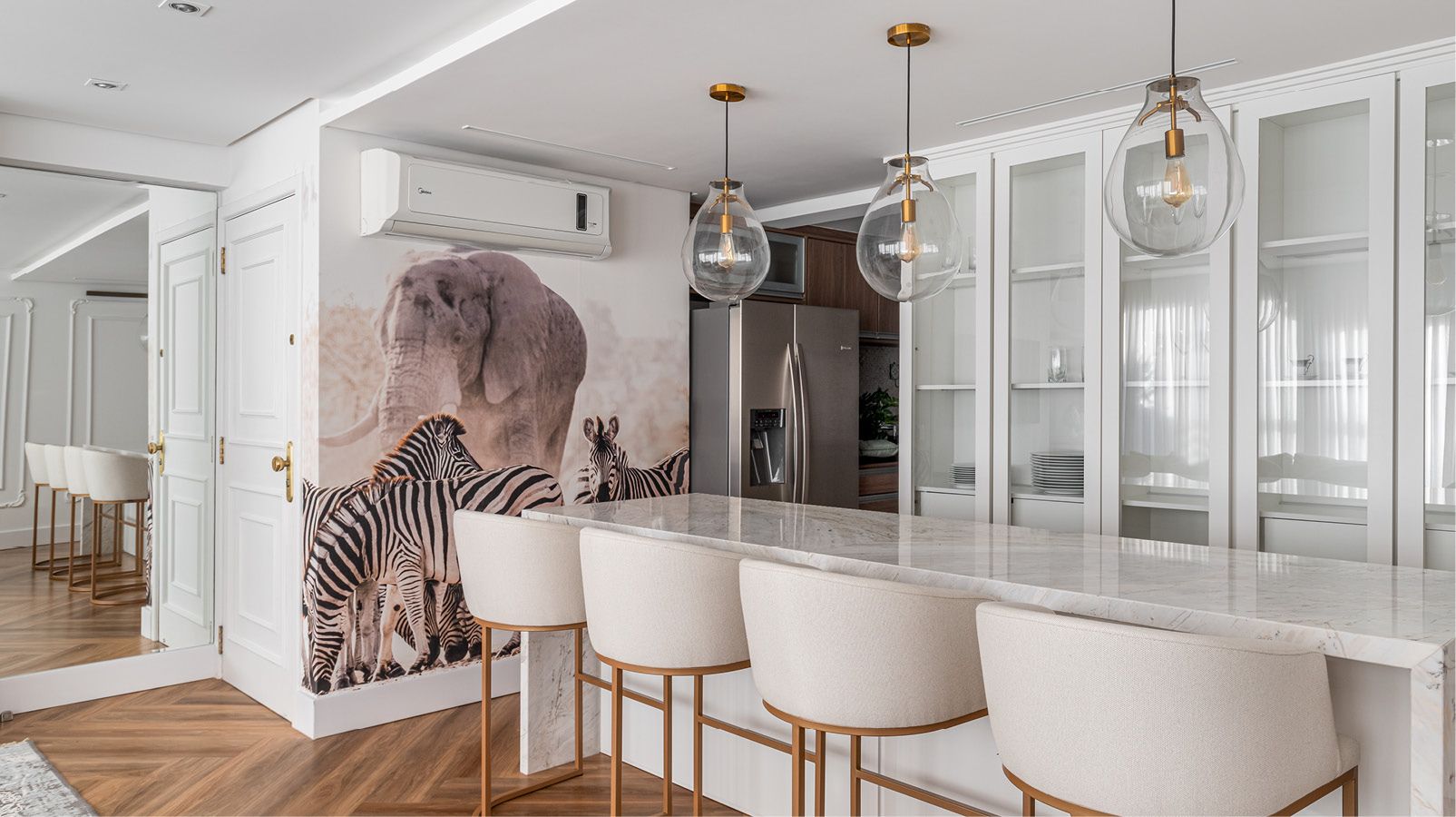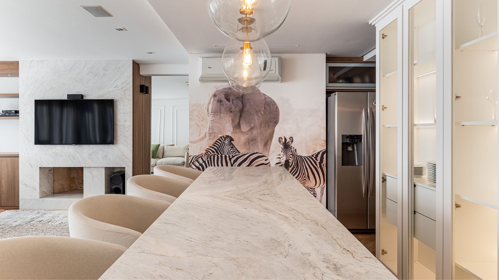 A descontração fica por conta da imagem nas paredes da área social, uma fotografia tirada em uma reserva africana que mostra uma sincronicidade de animais selvagens (elefante e zebras) improvável, já que elefantes são territoriais e, muitas vezes, espantam outros animais ao redor. O registro da fotógrafa Janaína Matarazzo acabou virando obra de arte impressa em papel de parede.