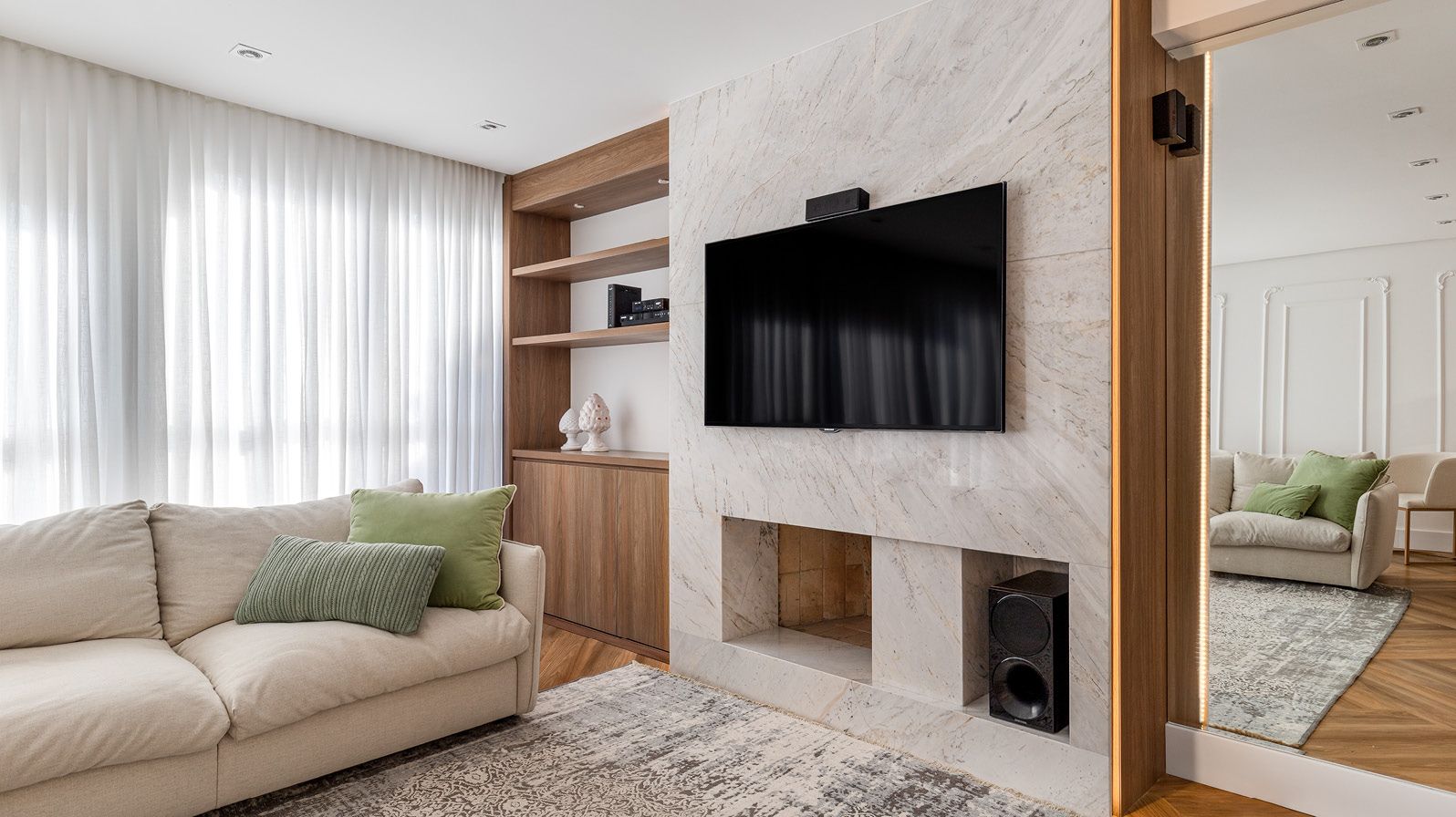 A grande cristaleira executada pela Benditta Marcenaria, que também tem a função de vitrine, integra a cozinha com a área social. Esta ilha recebeu a instalação de tampo em mármore branco Paraná Michelângelo, da empresa Basalto Santo Antônio. O mesmo mármore faz o revestimento da frente da lareira e do painel da TV da sala.
