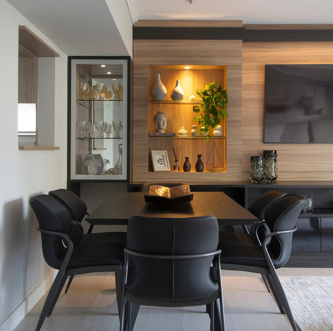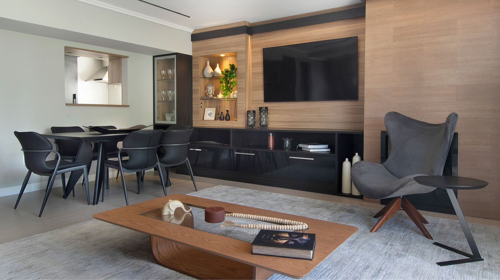 Com esse briefing, o desafio foi criar um ambiente contemporâneo que abraçasse mobiliários fixos já existentes, de forma que contasse uma nova história, fazendo desse apartamento uma moradia com personalidade. E esse conjunto de referências de épocas distintas foram desenvolvidos de forma harmônica, realçando belezas de diferentes períodos.