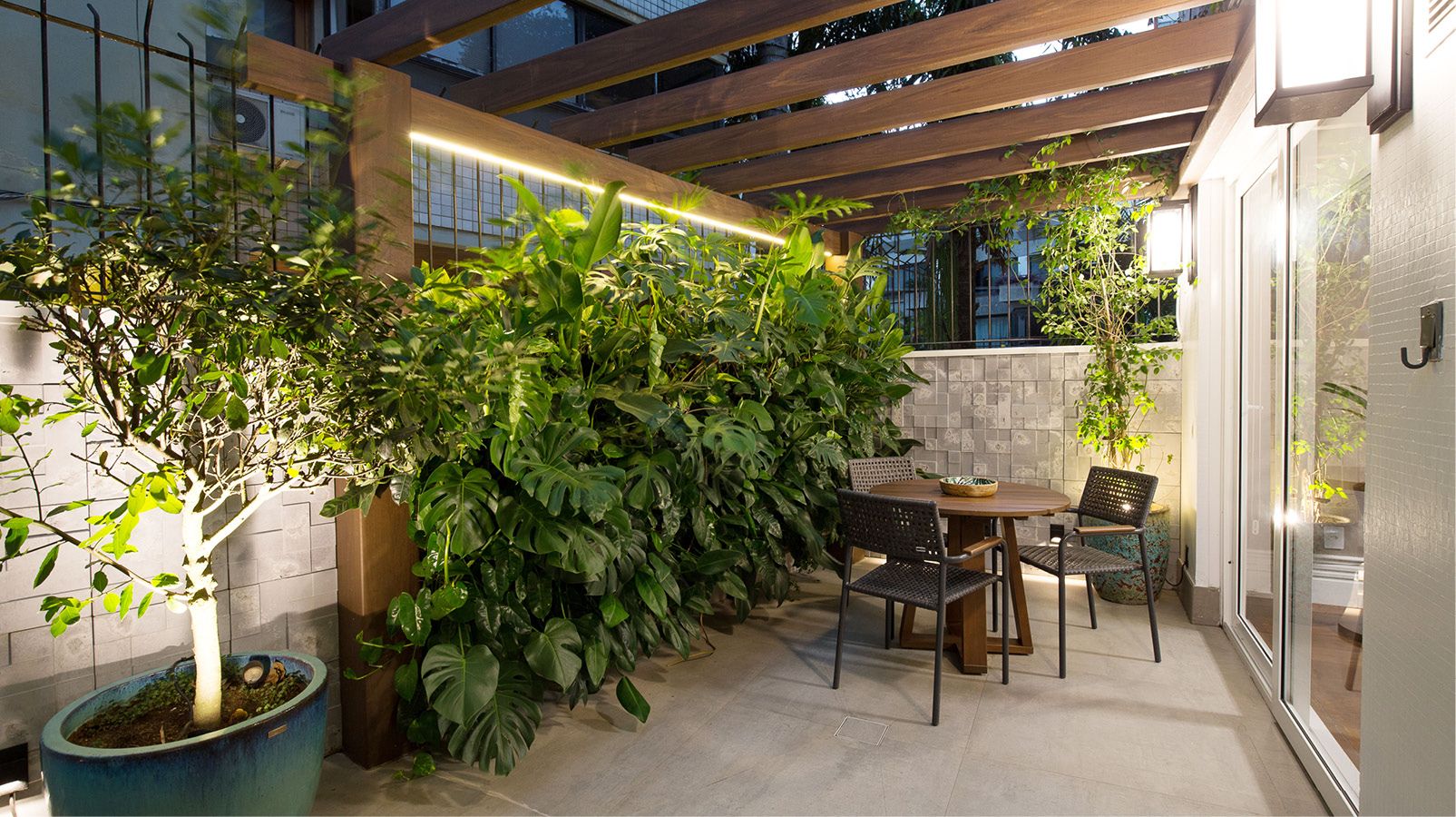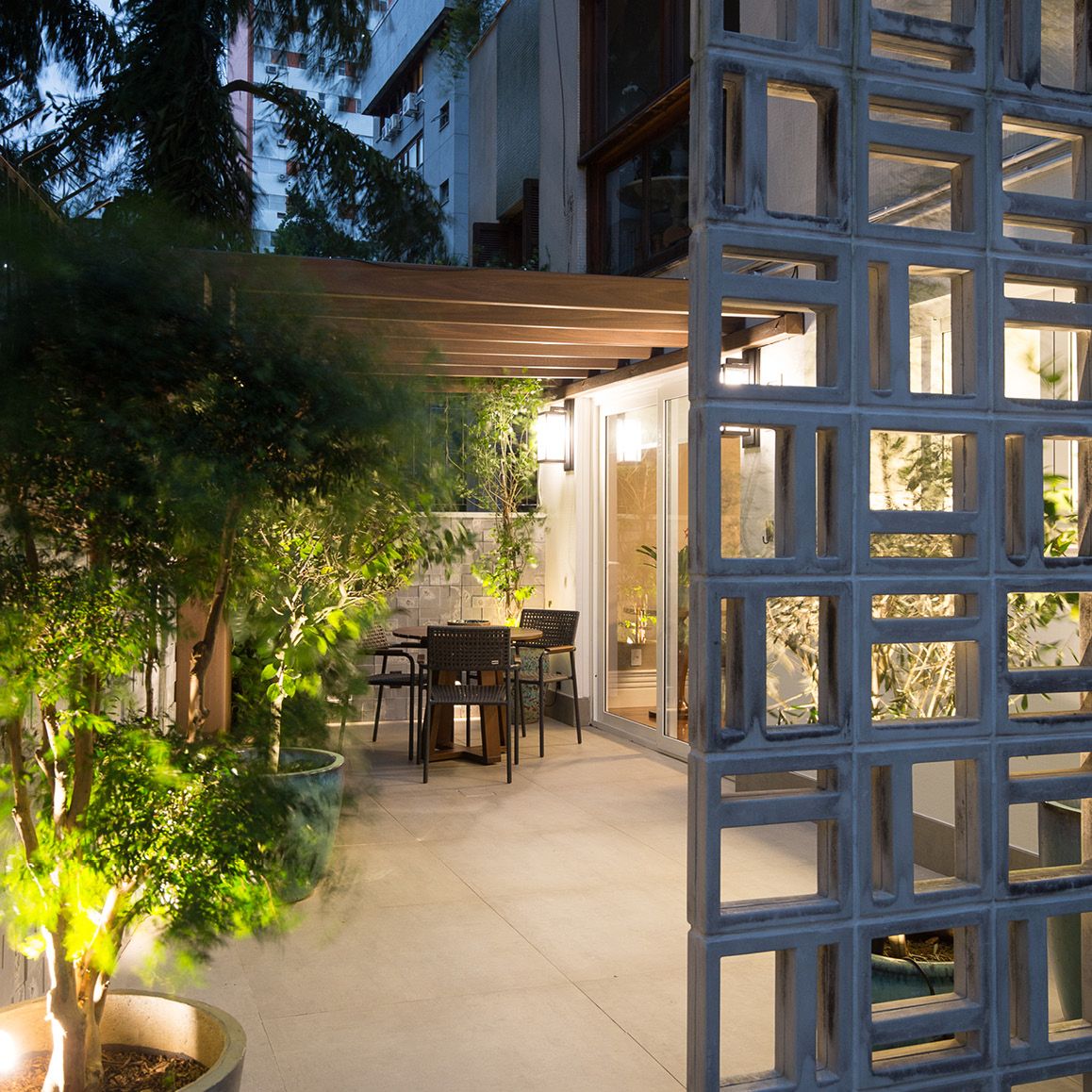 Para amenizar a configuração retangular do estar da família, as arquitetas criaram um jardim vertical na parede divisória do terraço, integrando o espaço interno ao externo. O pergolado com vegetação pendente cria privacidade e sombreamento no verão. O piso, em porcelanato com aspecto de cimento queimado, e o revestimento cimentício nos muros divisórios imprimem o contexto urbano ao ambiente. O cobogó delimita a zona de estar .