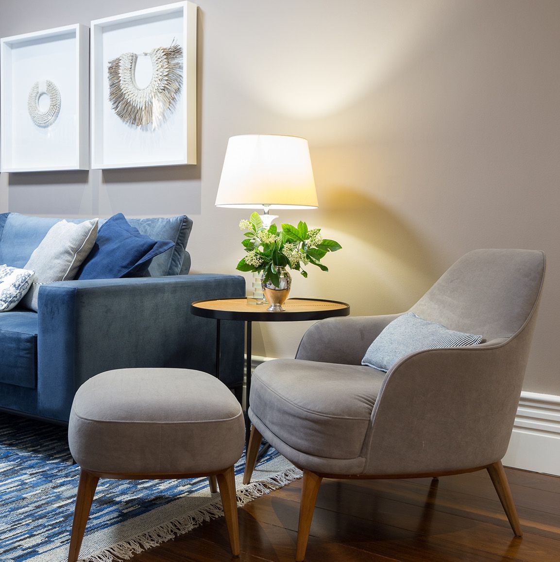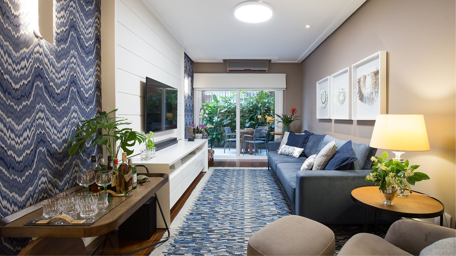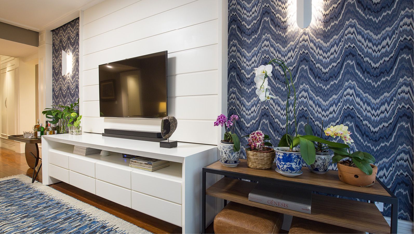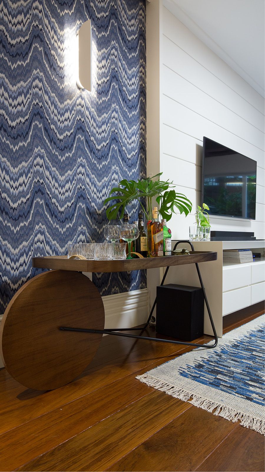 O estar da família, lugar de convívio do casal e dois filhos, ganhou uma atmosfera despretensiosa e elegante com o revestimento de tecido da Textura nas paredes que renovou o móvel existente para o home theater. A poltrona Constantina com design do Studio Saccaro entregou o conforto desejado nas noites de filmes e séries. Para completar o clima, nada melhor que um carrinho de bebidas: tudo à mão e prático. Foi escolhido o modelo Bar Vello (Saccaro) com design de Fabrício Roncca.