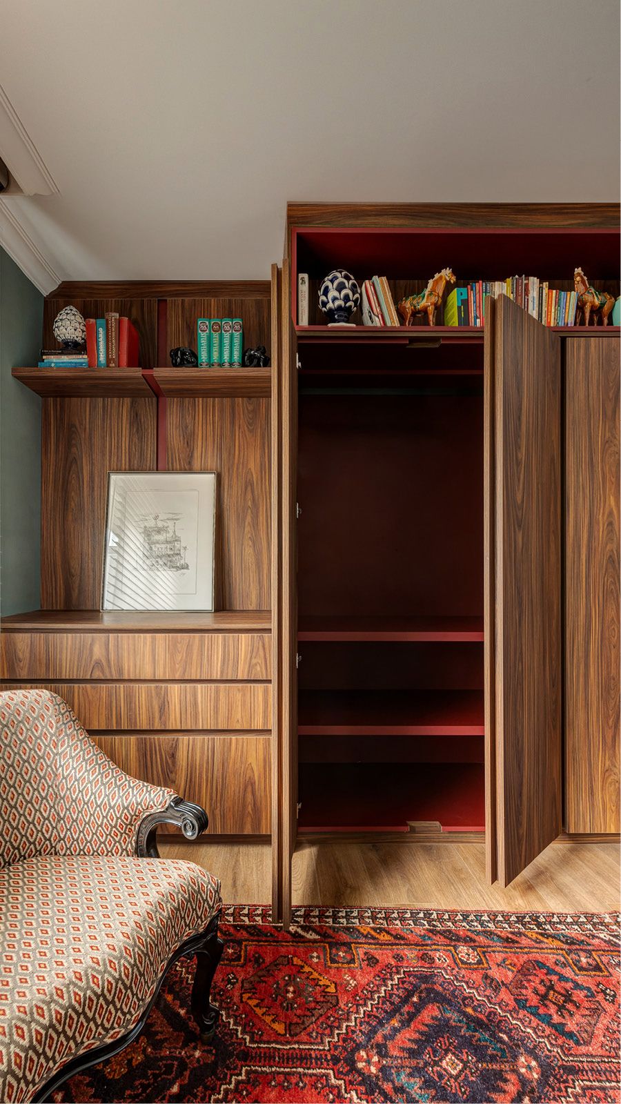 Ao observar atentamente este projeto executado pela Romanzza Moinhos de Porto Alegre, nota-se que todo o interior do móvel é no tom Marsala, fazendo um contraponto com a nobreza da lâmina natural em pau ferro.