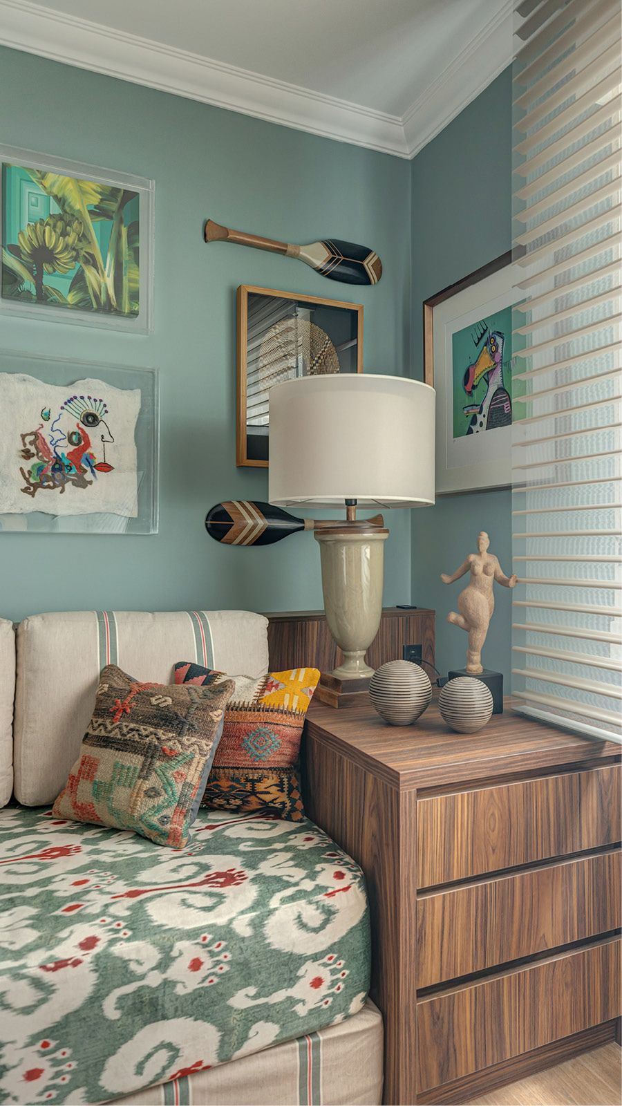 A iluminação é pontuada com uma peça central e luminárias de mesa, dando um toque especial e aconchego ao ambiente, além de valorizar as cores dos tecidos da linha Ikat da Entreposto.