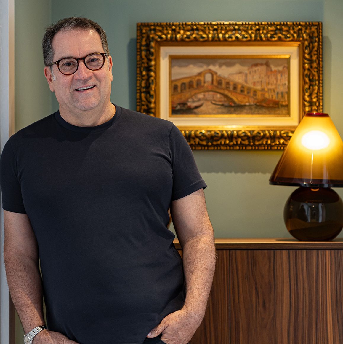 Abraçando o sofá, Eduardo criou uma caixa em pau ferro com duas alturas diferentes, colocando sobre elas uma composição de quadros com fotos e arte.