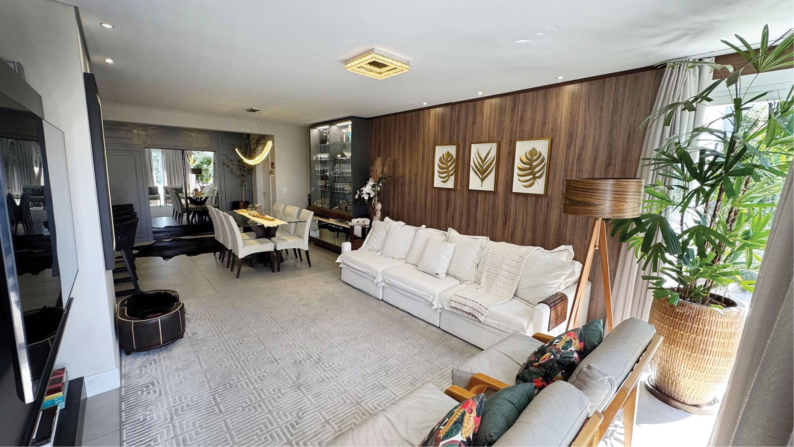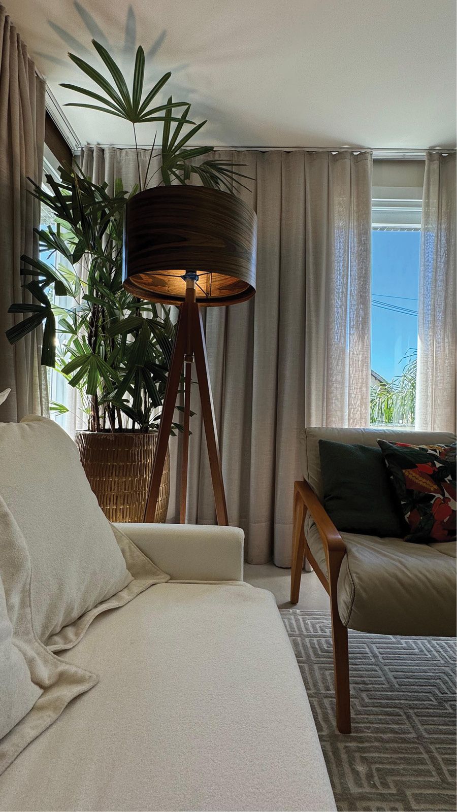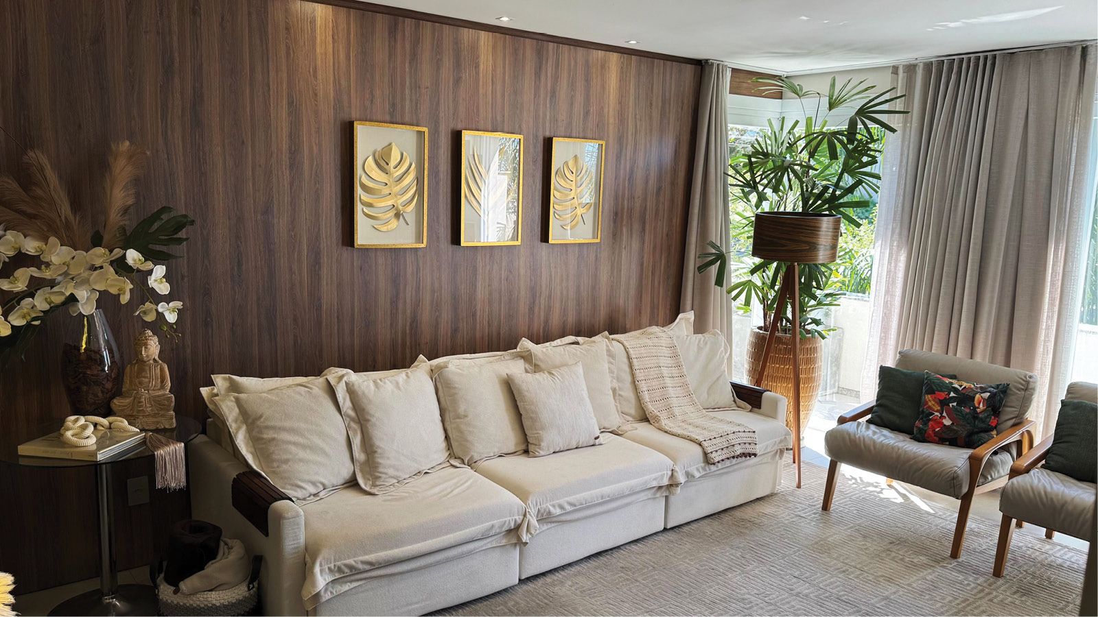 O sofá Palermo, garimpado na NM Zona Sul, foi escolhido em tecido buclê na cor off-white e, na sua versão com três assentos retráteis, garante sofisticação e conforto absoluto. Sua volumetria, aliada à tonalidade neutra e à textura suave do tecido, cria uma base perfeita para o ambiente que se transforma em palco de encontros, conversas e momentos de pausa.