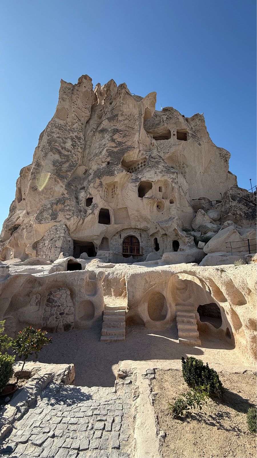 Em primeiro lugar, saiba que a Capadócia é muito mais do que os passeios de balão. É Patrimônio Mundial da Unesco, uma região com formações geológicas complexas e únicas no mundo, que começaram a se formar a partir de erupções vulcânicas que depositaram camadas de rocha: o tufo (macio, de cinzas) e o basalto (duro, de lava). Milhões de anos de erosão do vento e das chuvas desgastaram o tufo macio mais rapidamente do que o basalto duro no topo, esculpindo as “chaminés de fada”! Nós ficamos quatro dias por lá, tempo suficiente para explorar bem toda a região e os principais passeios. Alugue um carro para ter mais flexibilidade e liberdade para visitar as cidades próximas ao seu hotel. E, claro, fique hospedado em um hotel caverna. O nosso era simplesmente um sonho, um luxo: o Yunak Evleri, em Ürgüp.