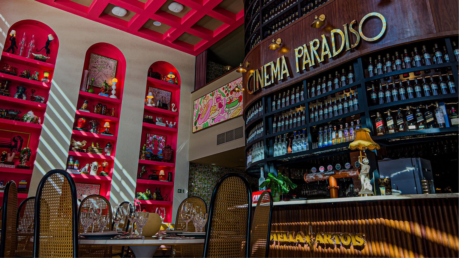 Almoçar no Cinema Paradiso é viver um espetáculo que começa pela arquitetura e decoração. O espaço reúne três ambientes: o salão principal, um jardim italiano encantador e o espaço superior para mini-eventos, no coração da Rua Coberta. Entre os detalhes que me encantaram, a vitrine de massas artesanais. Na mesa, provei a Burrata Paradiso, seguida pela paleta de cordeiro laqueada e, para finalizar, a sobremesa Afogado